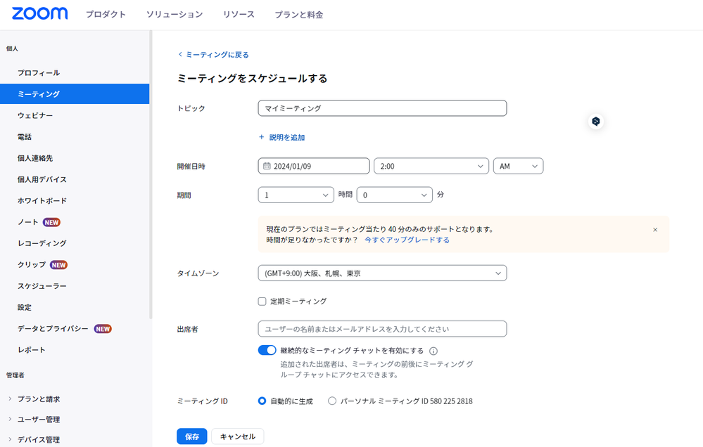 Zoomのアカウントは無料のやつでも会社のでもとりあえずオッケー。そのアカウントで会議を作成します。
