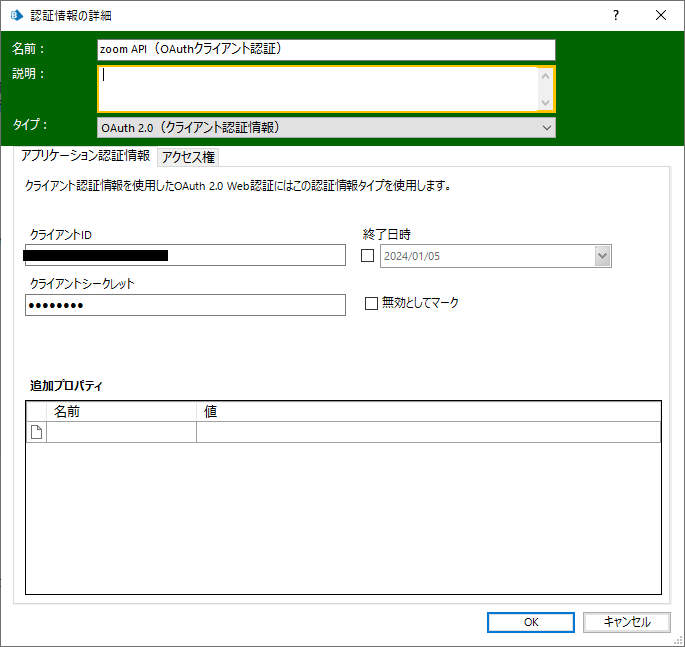 クライアントID、クライアントシークレットを、OAuthクライアント認証で作成します。