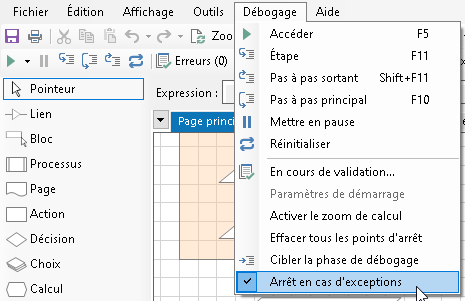 Activez toujours l'option « Arrêt en cas d'exception » pendant le développement et le débogage en studio mode. Ce feature permet d'arrêter le déroulement du processus en cas d'exception. Sans cette option, le processus continuerait à exécuter, ce qui ne rendrait pas le débogage plus facile.