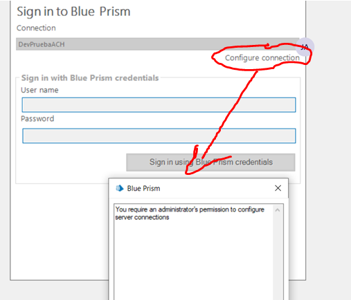 El usuario debe tener privilegios elevados para el acceso de administrador para editar / crear la configuración de conexión en Blueprism