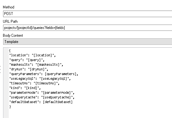 "message": "Invalid JSON payload received. Unexpected token.\n\n\"queryParameters\": ,\r\n\"useLegacySql\": \"\n ^",