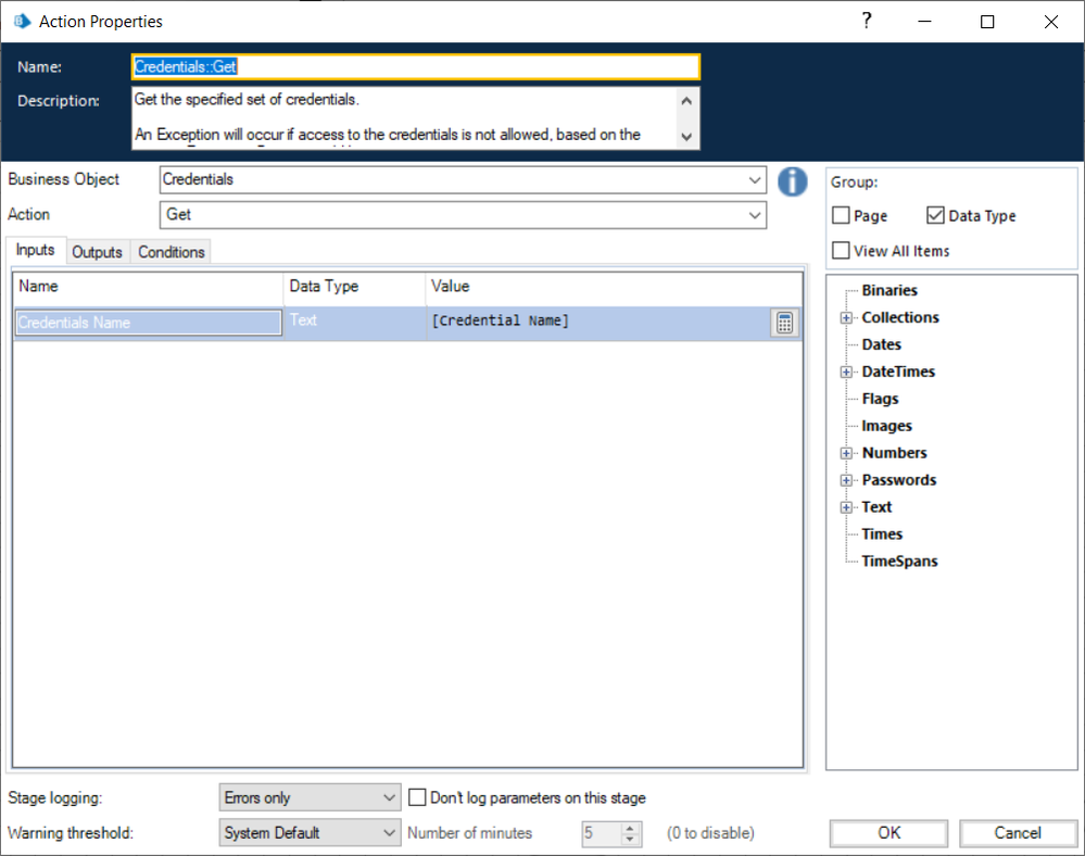 Next, in my process, I'll use the native Credential VBO to get the Username and Password value based on the name of the credential.