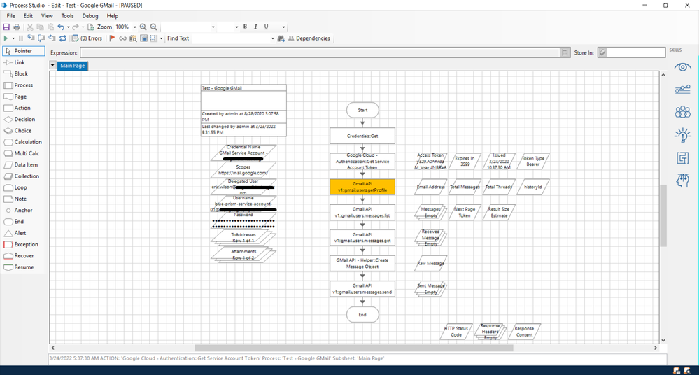 Get Service Account Token action and pass in the Username, Password, my scopes, and the delegated user email address.