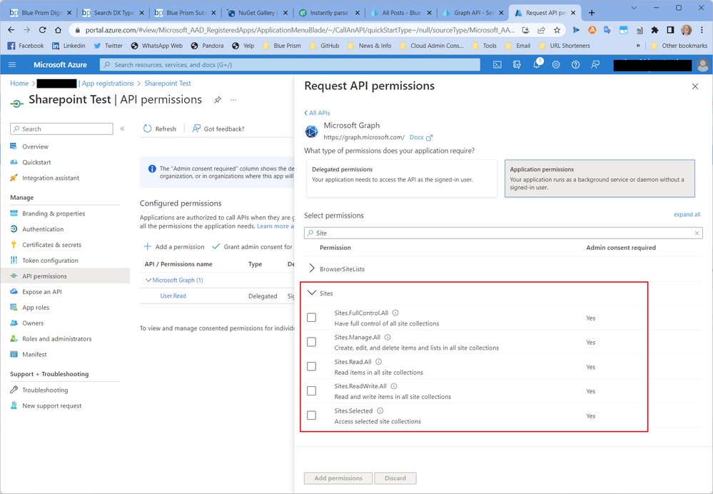 To use the Graph API you must also apply the appropriate permissions to the specific application registration you create in the Azure portal. As an example, if you've create an application registration, and credentials, for working with Sharepoint, you'll want to apply the necessary Site permissions as depicted in the example below:
