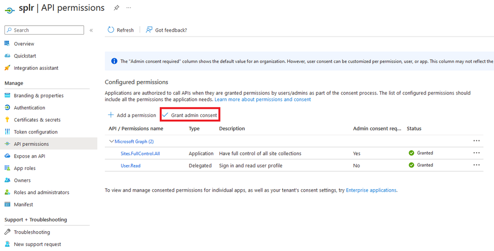 I believe that message is related to the permissions that have been granted in your app registration within the Azure portal. Make sure you have added the permissions you want and then click the Grant admin consent to apply them.