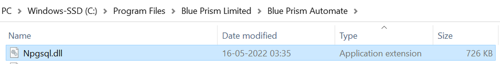 Once, the file got downloaded copy the npgsql.dll file to your Blue Prism's installation folder as shown below: