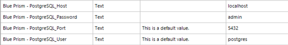 On your Blue Prism client, first you need to set up the proper values for the environment variables associated with your imported business object for PostGreSQL as shown below: