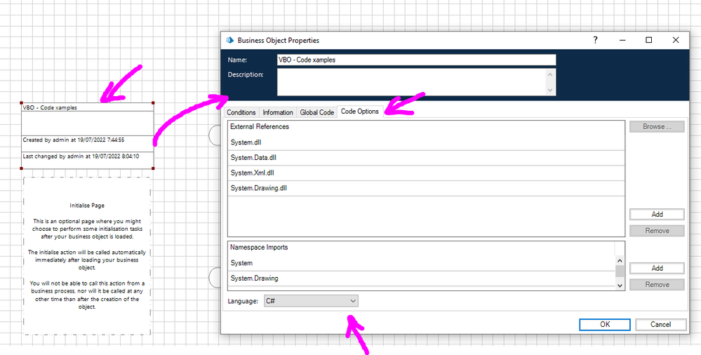 - Change the language of your VBO to C#. For this, go to the Initialise Page, double clic on the properties, and go to the Code Options tab, here change the Language to C#