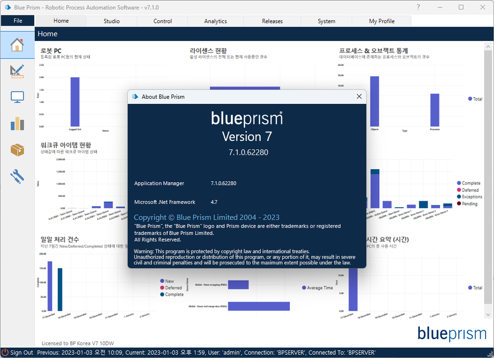 Blue Prism 버전 정보는?(Help) > About 아래 애플리케이션에 포함되어 있습니다. 아래 예는 Blue Prism 버전 7.1.0을 보여줍니다.