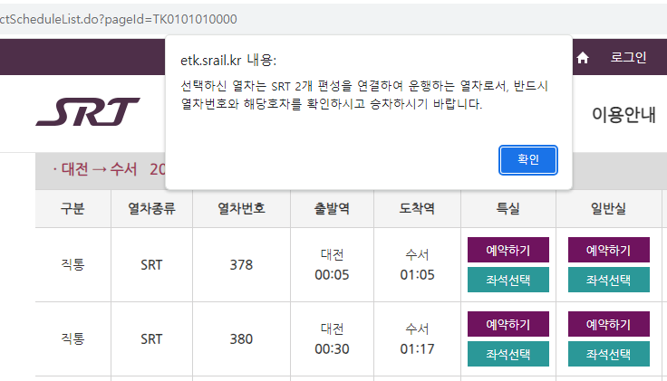 크롬 팝업 "etk.srail.kr"이 뜨면서 "확인"버튼을 누르기 전까지 다음 화면으로 넘어가지 않아서 캡쳐 주신 경우가 발생하는 것으로 봅니다.