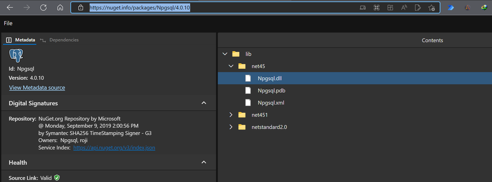 net45 버전으로 npgsql.dll(버전 4.0.10)을 다운로드했는지 확인할 수 있습니까? 다음 Nuget 패키지 피드 URL에서 dll을 다운로드할 수 있습니다. Npgsql v4.0.10