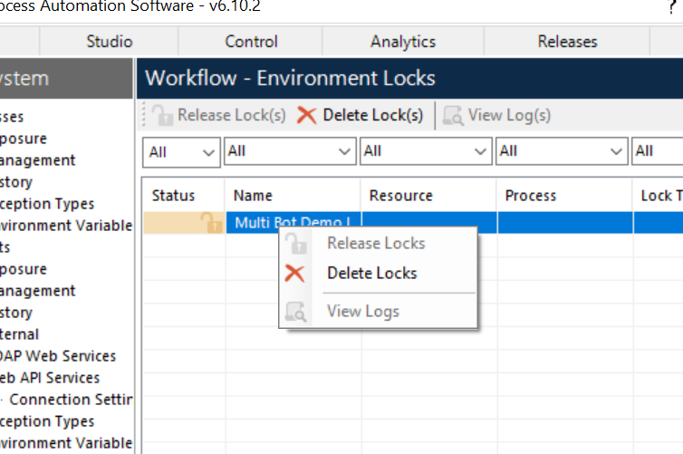 Also, if in you automation process, let say you deal with an application where the User ID is same for all the bots and only one session can be created at a time. Then ideally you won't want multiple robots to work on that session. Here also, Environment Locking works.