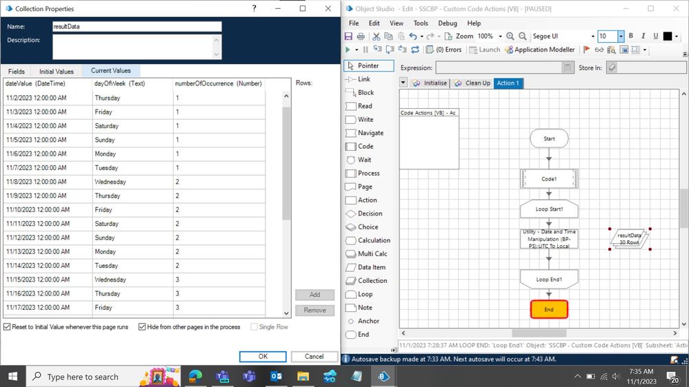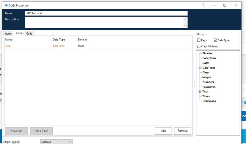 Strange one. I just ran your codes on my BP, 7.1.1 and I got the anticipated result for November. I think Blue Prism uses your local OS time to do DateTime variables. If you convert the UTC back to Local Time, I wonder if that resolves the bug. I don't know enough about your code to hardcode the month of October into the code stage. I have added an action in a loop to convert UTC back to Local, now everything is being set to the top of the hour for every row. I have attached the code for converting UTC back to Local and its input/outputs. You could add it to your existing code or do as you please with it. Let me know if this works.