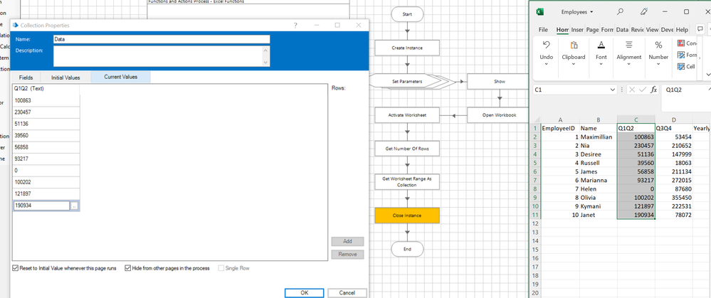 where the 'Number of rows' data item was retrieved from step VI. This action returns me all the values present within the 'C' column in my dataset in form of an output collection called as '