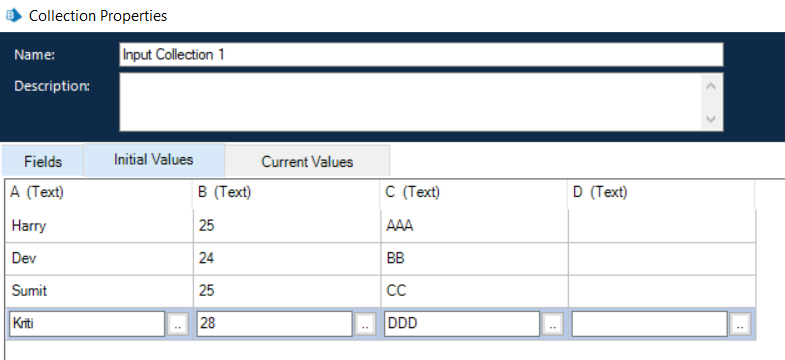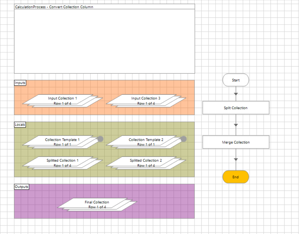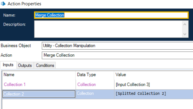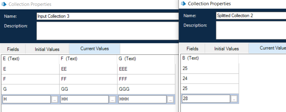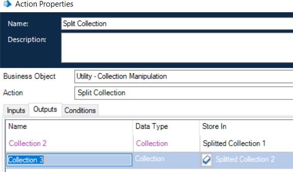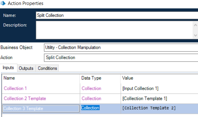 4) The inputs of the Split Collection should have the collection having all four fields, A,B,C and D along with the two single row collections which we are using as templates and the output should be assigned to the above two empty collections that we created. Refer to the below inputs and outputs for the 'Split Collection' action