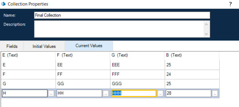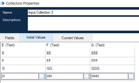 1) Have two collections in place, in my case "Input Collection 1" has the fields A,B,C,D and "Input Collection 3" has the fields E,F,G both with some data present as shown below: