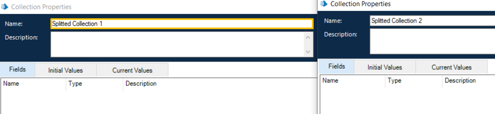 3) Store the output of the previous action into two undefined collections whose fields need not be created. In my case, these collections are 'Splitted Collection 1' and 'Splitted Collection 2' as shown below:
