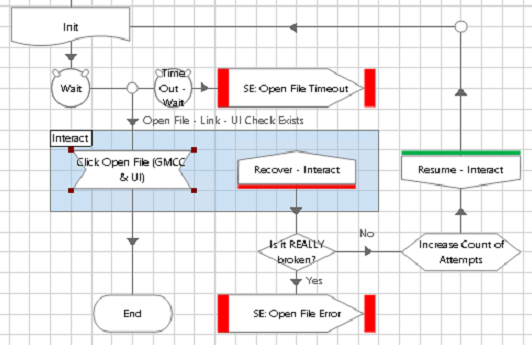 As you can see, if the Link does not exist, we Time Out. If if we can't interact it with we have a retry loop but then ultimately raise an Exception. In all of the terminations, this page has completed (on the 1st cycle) and not raised any errors. The process therefore assumes that Excel is open and thigs can continue.