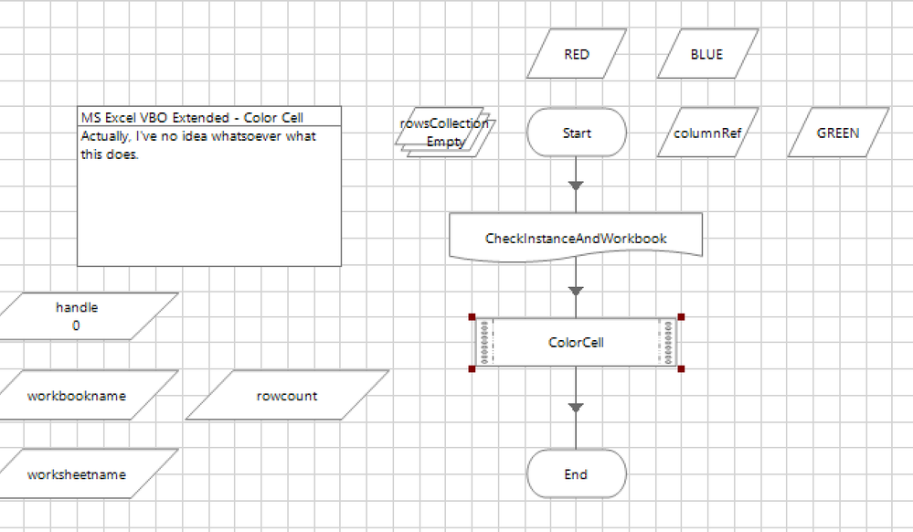 Code Dim xl, wb, ws, r, i, f as object Try     xl = GetInstance(Handle)     if Workbook_Name = "" then         wb = xl.activeworkbook     else         wb = xl.workbooks(Workbook_Name)         wb.activate     end if     ws = wb.activesheet     if Ref.Trim = "" then         r = ws.usedrange     else         r = ws.range(Ref)     end if     i = r.Interior     i.ColorIndex = Background_Colour     f = r.Font     f.ColorIndex = Foreground_Colour Catch e As Exception     Success = False     Message = e.Message Finally     xl = Nothing     wb = Nothing     ws = Nothing     i = Nothing     r = Nothing     f = Nothing End Try