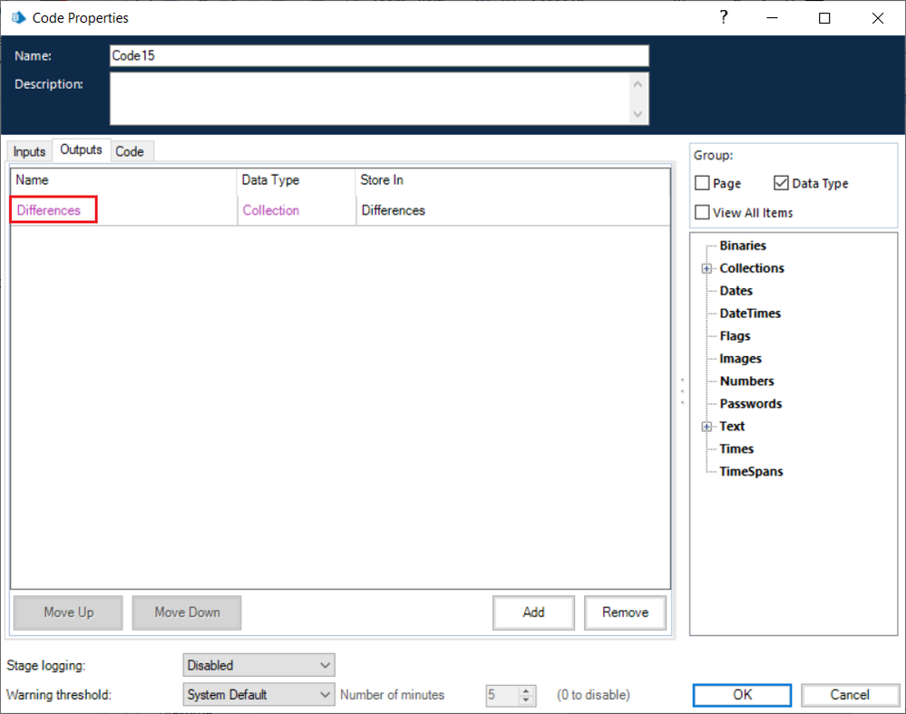differences error, did you define an Output data item names