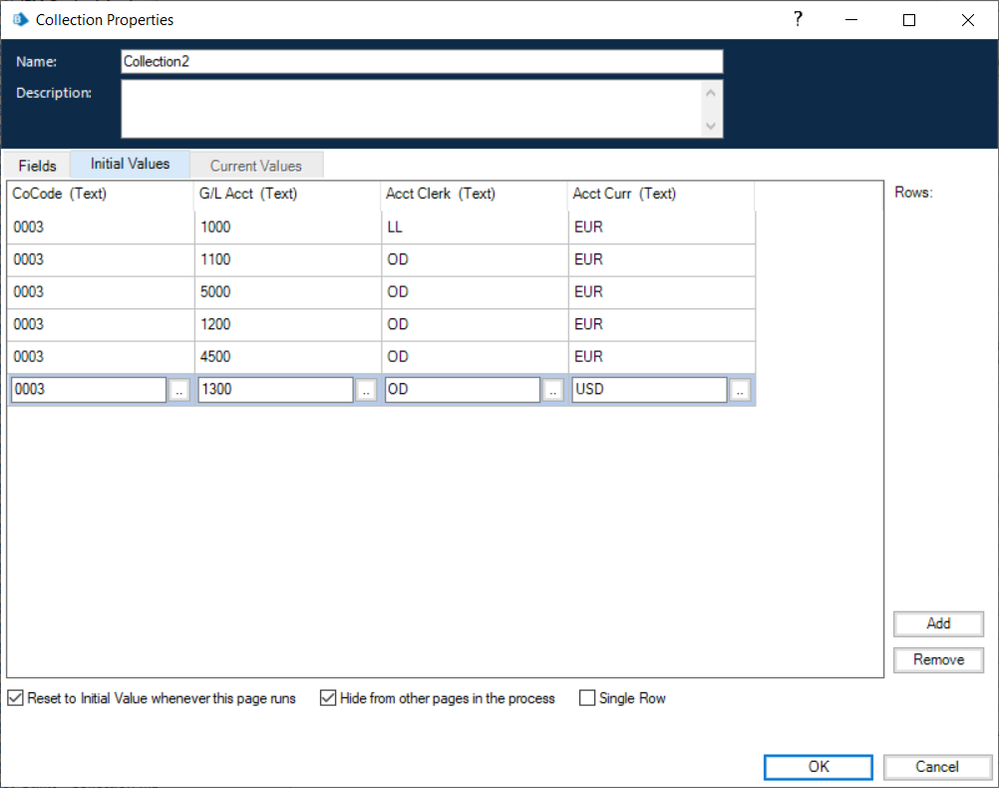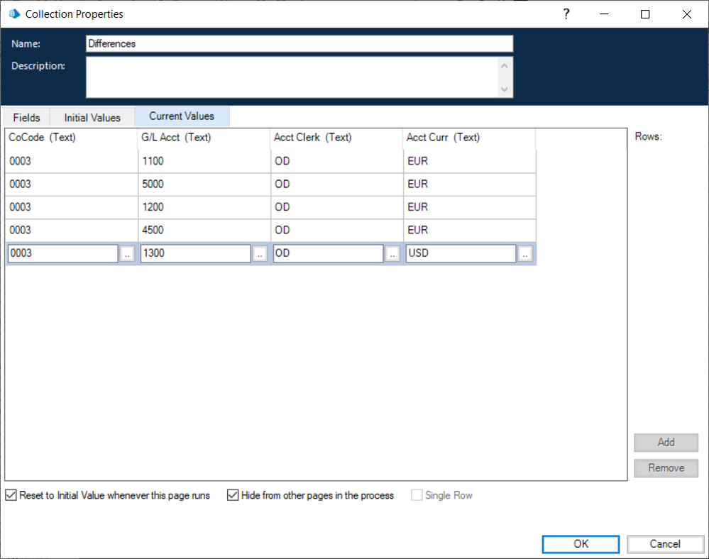 - the values of any of the other columns, in Collection2, do not match between rows, of Collection1, that have a matching G/L Acct.