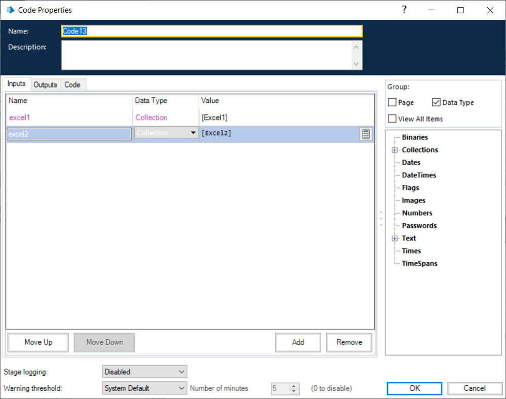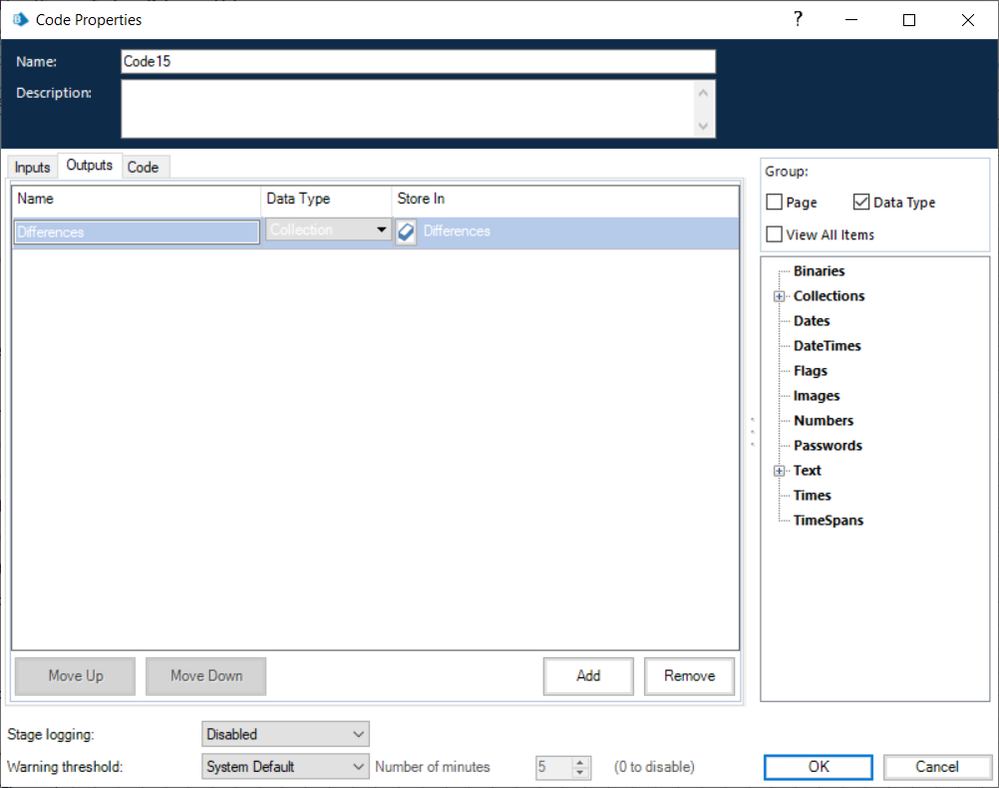 var differences variable you defined in the code. If you refer back to my example, I used a capital "D" on the output data item. It makes a difference, no pun intended, because of case sensitivity.