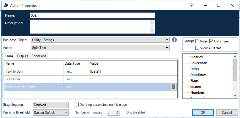 When you call the action "Split Text" from the VBO "Utility - Strings" you need to indicate the original text and the char to split. And as output parameter the collection that you want to store the info. This function has a third parameter, the "Collection Field Name". If you didn't fill this field, you need to add manually a column in your output collection called "Column1" (If you don't make this, the process will fail) (Maybe this was the problem, I don't know)
