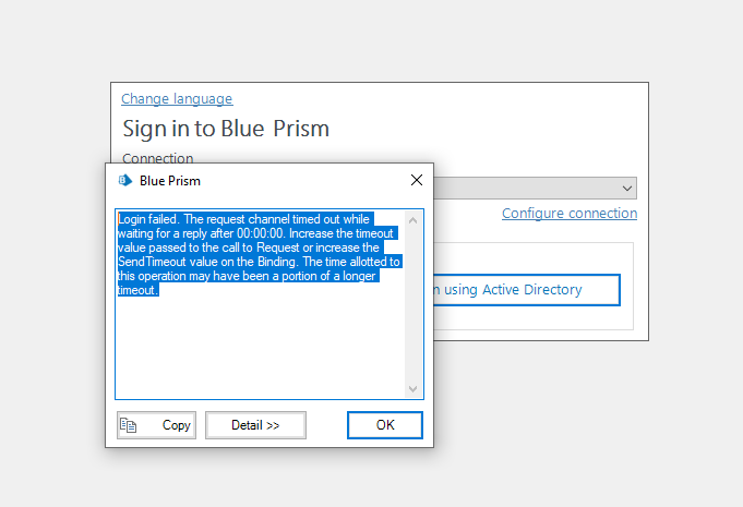 "Login failed. The request channel timed out while waiting for a reply after 00:00:00. Increase the timeout value passed to the call to Request or increase the SendTimeout value on the Binding. The time