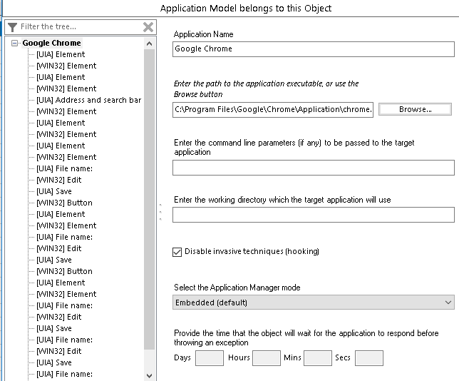 As observed with Capture 3.0, The Element Tree which is created in the Application Modeler contains only UIA and WIN32 Modes. I Captured and recorded the clicks of one Application which is opened in Chrome Browser but the object which Capture is creating shows Windows Application and contains only UIA and Win32 Modes.