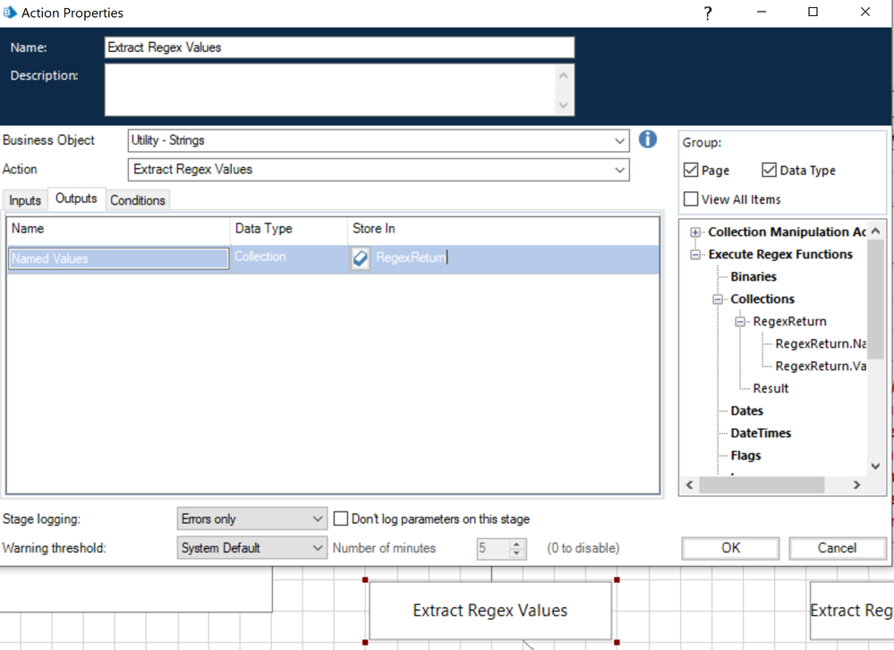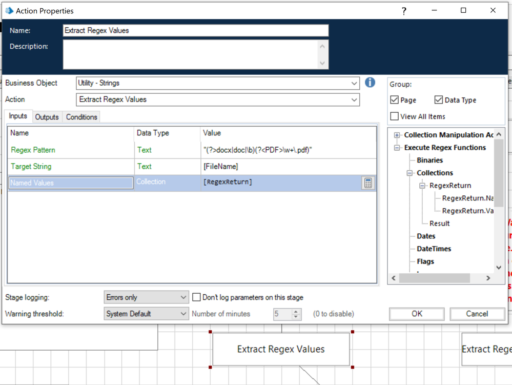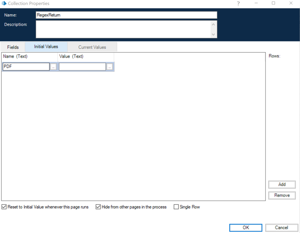 'RegexReturn'. This collection must have the name of the group defined when you are creating it as an Initial value. In our case, since we are working on the Regular Expression for PDF first we will be using the group name that is highlighted in our regular expression :
