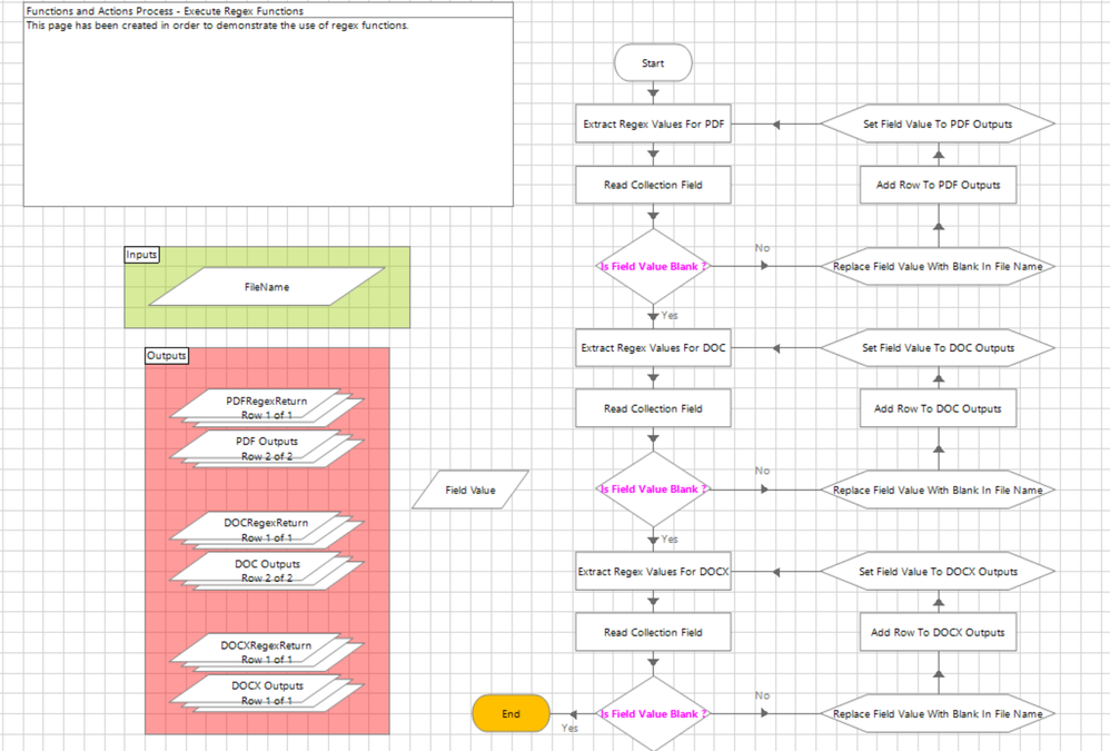 You need to repeat the same steps in order to create two more similar actions for the keywords DOC and DOCX where the only change would be in the regular expression and the group name. Also, for these two actions you need to create two separate collections where the respective group name value will be stored.