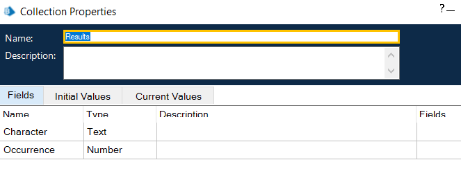If the value of the flag is False, we would set two data items called as 'Current Character' (Text) and 'Occurrence' (Number) with the following calculation stages: