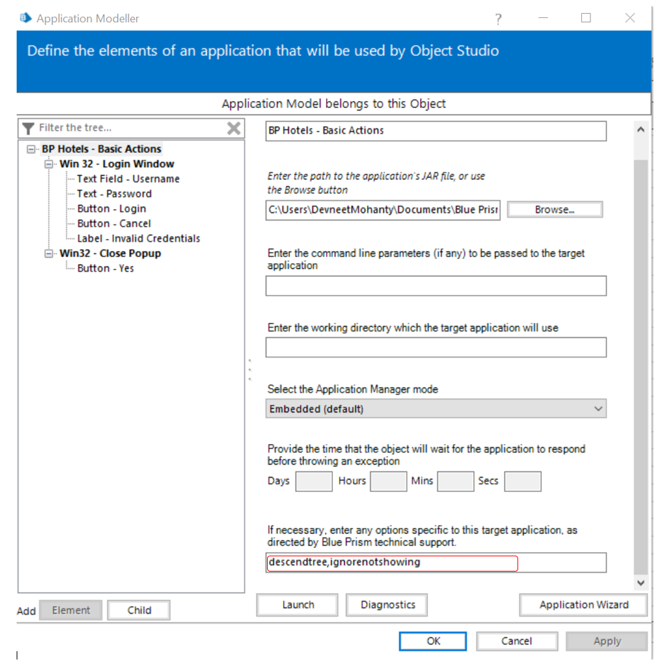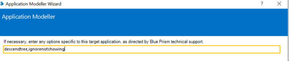 descendtree' flag, what it does is basically it is going to show you all the elements including the ones which are not visible to the screen as it scans at a deep level to retrieve the elements from the backend of the application but since it shows you all the elements it is sometimes slower and can also crash your application modeler if the memory exceeds the 32 bit memory capacity of your Blue Prism Interactive Client. This feature is a not useful because many times a lot of elements in a JAVA application are hidden and are only visible upon some event trigger.